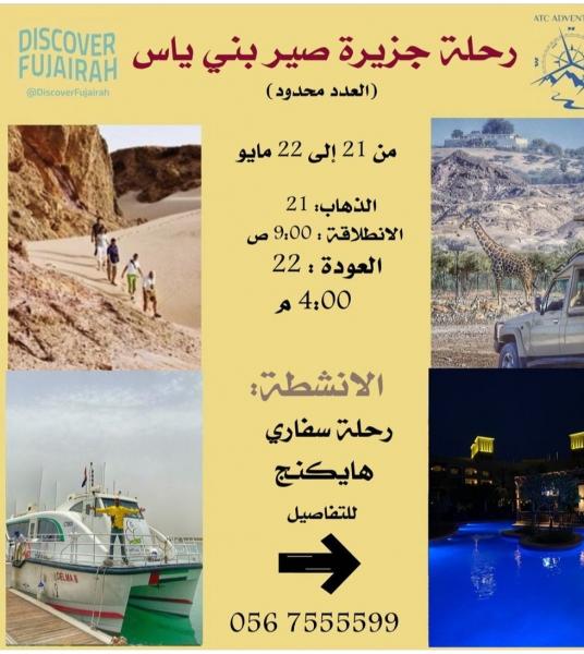 * 21 مايو التجمع في أبوظبي والانطلاق بالسيارات الى ميناء جبل الظنة يبعد ساعتين ونص وثم الصعود الى العبّارة للانتقال إلى جزيرة صير بني ياس .