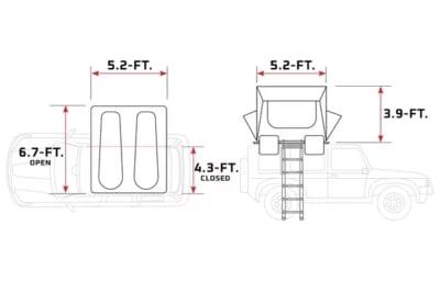 الأبعاد (مغلقة): 5.2 قدم × 4.3 قدم × 1 قدم (1600 × 1300 × 320 مم) الأبعاد (مفتوحة): 5.2 قدم × 4.3 قدم × 3.9 قدم (1600 × 1300 × 1200 مم)