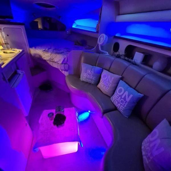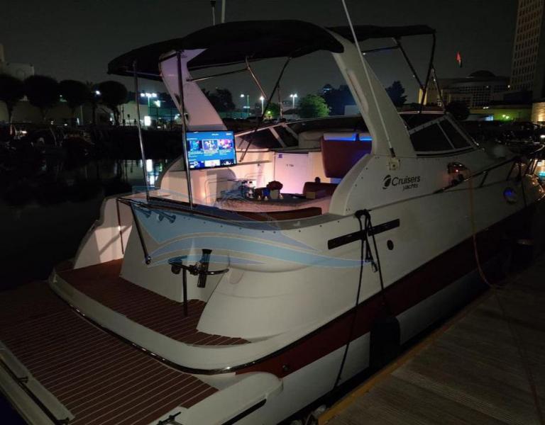 اليخت مكون من غرفتين و حمام و صالة و المكيف مارين وجلسة خارجية ونظام ملاحة و بدون عربانه ونظام انذار للحرائق ونظام الحمايه SOS ونظام Fusion system التحكم يدوي بالهاتف وسماعات داخليه و خارجيه واضاءه داخليه و خارجيه و اضاءه اسفل الماء و مكرويف و ثلاجه و شوايه و مكينه كوفي وتم تبديل جميع القطع الاستهلاكية للمحرك وعمل سيرفس شامل وتم عمل انتيفولينج وتم تبديل الحمام بالكامل و الوتر بامب جديد .