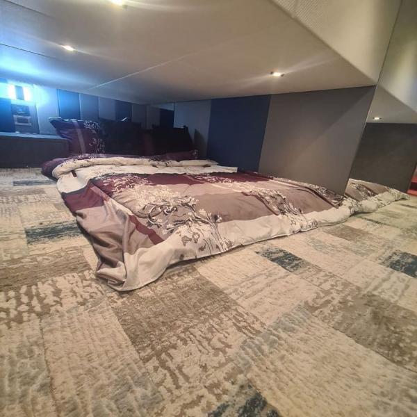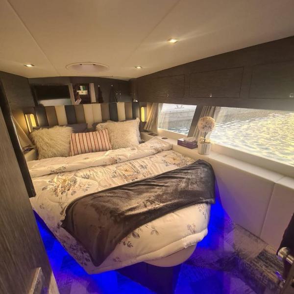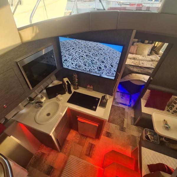 اليخت فيه صالة جلوس مع كبينة القيادة .. و صالة طعام لأربعة اشخاص و غرفتين للنوم و حمام و مطبخ .. بالإضافة للإنارة اللي تحت الماء عدد 6